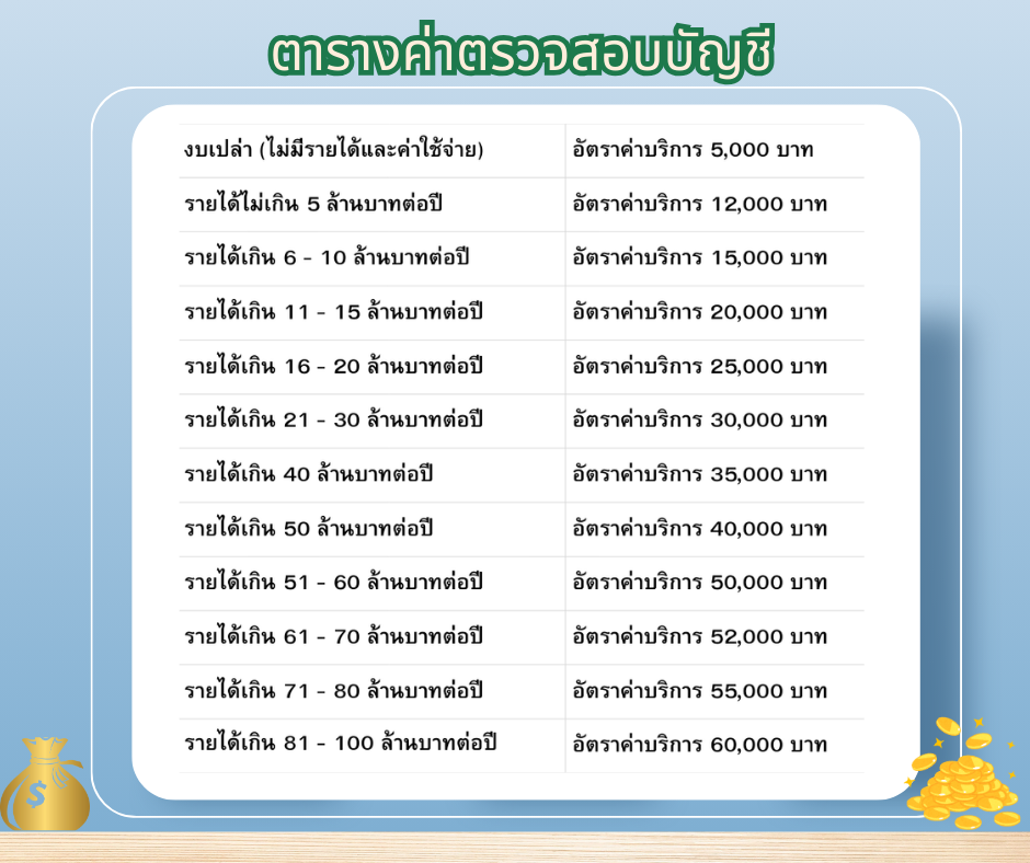 รับตรวจสอบบัญชี โดยผู้สอบบัญชีรับอนุญาต และผู้สอบบัญชีภาษีอากรที่มีความเชี่ยวชาญ และมีประสบการณ์สอบบัญชีมากกว่า 25 ปี สามารถตรวจสอบได้ทุกประเภทธุรกิจทั้งด้าน บริการ เครื่องจักร และโรงงานอุตสาหกรรม ฯลฯ